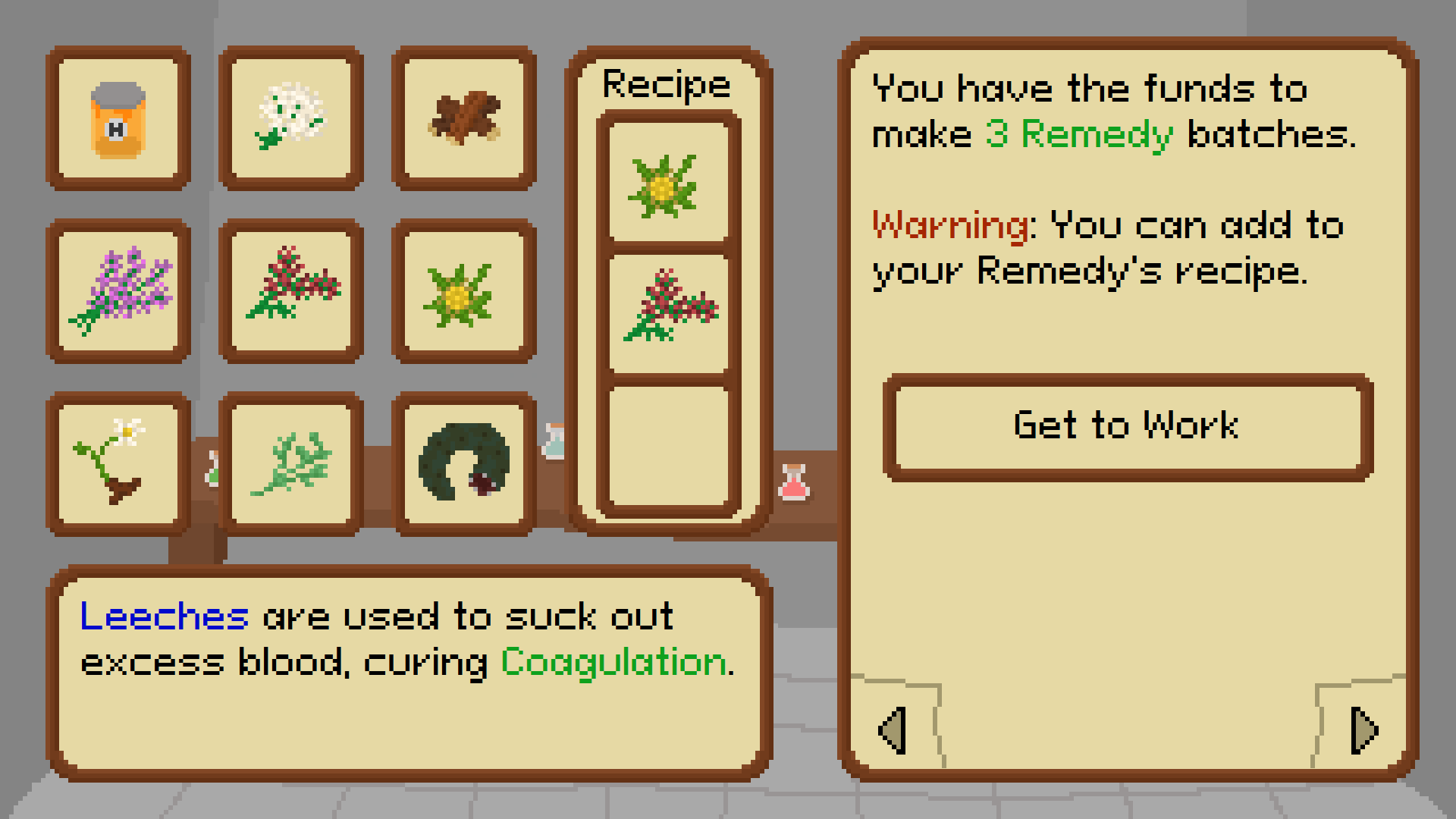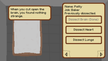 As the doctor of a small medieval town, you have 7 days to cure the townsfolk of a deadly disease. At dawn, create remedies to cure the townsfolks' symptoms. Spend the day examining the townsfolk for visible symptoms and ask them questions to learn about mental symptoms. At dusk, take the opportunity to dissect the corpses of the infected for hidden internal symptoms which could give you clues to finally curing the disease.